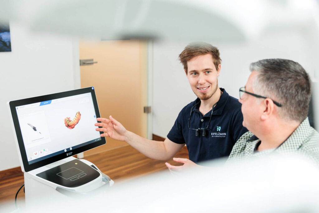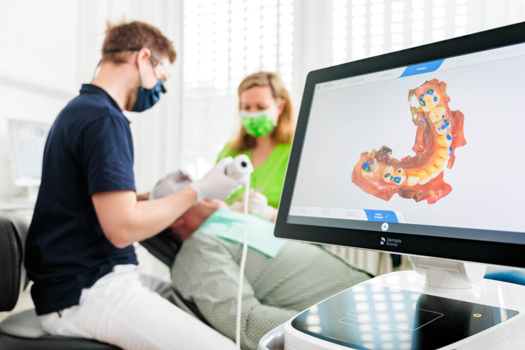 Unsere Praxis verfügt über das moderne Computersystem CEREC, mit dem sich Zahnersatz aus Vollkeramik — sprich Inlays, Kronen, Teilkronen, Veneers oder Brücken — in nur einer Sitzung herstellen lässt. CEREC ist die Abkürzung für CERamic REConstruction (keramische Rekonstruktion) und steht für ein dentales Hightech CAD/CAM-System zur Herstellung vollkeramischer Restaurationen.